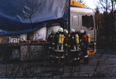SCHWAIG (DB2) - Am Dienstag, dem 19.01.99, bemerkte der Fahrer eines LKWs, nachdem er sein Fahrzeug auf dem Parkplatz Fischbach auf der A9 abgestellt hatte, dass ein weißes Pulver aus dem Laderaum seines LKWs austritt. Während der Fahrt wurde einer der Säcke beschädigt. Daher wurde Alarm für die Feuerwehren Schwaig und Röthenbach/Pegnitz ausgelöst. Der Parkplatz wurde komplett gesperrt. Bei der Erkundung unter schwerem Atemschutz wurde festgestellt, dass nur eine geringe Menge Paraformaldehyd, ein gesundheitsgefährdender Stoff, der sich bei 30°C spaltet, explosionsgefährlich und wassergefährdend ist, ausgetreten war.