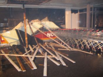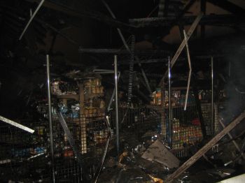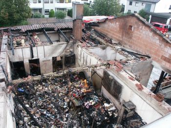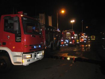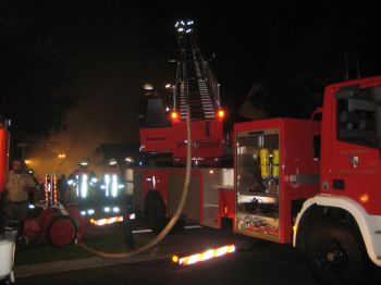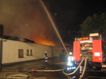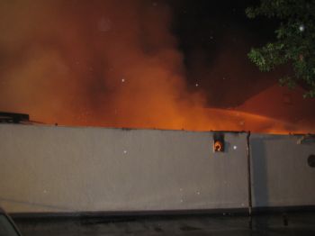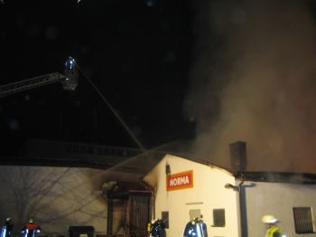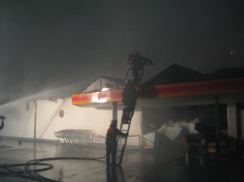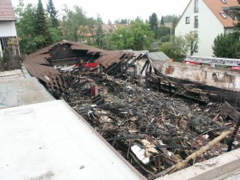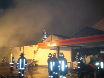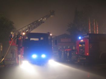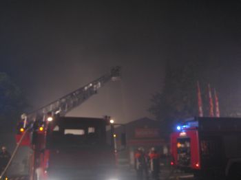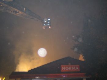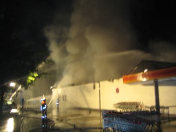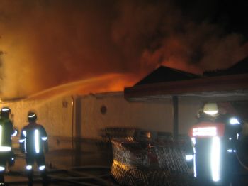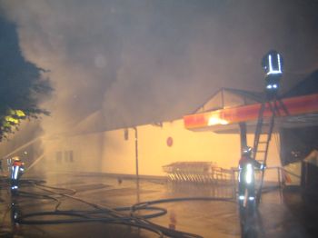 RÖTHENBACH/SCHWAIG - Für die Aktiven der FF Röthenbach war die Nacht zum Montag, 12. September 2005, um exakt 0.55 Uhr zu Ende. In Schwaig stand die Norma-Filiale in der Nürnberger Straße lichterloh in Flammen. Zur Unterstützung der Feuerwehren Schwaig und Behringersdorf wurde die Röthenbacher Wehr im Rahmen der überörtlichen Hilfe alarmiert. Beim Eintreffen an der Einsatzstelle wurden durch die örtlichen Wehren bereits mehrere Rohre zur Brandbekämpfung eingesetzt, das Dach war bereits vollständig eingestürzt. Während die FF Schwaig von der Rückseite des Gebäudes aus gegen die Flammen vorging, wurden die Kräfte aus Behringersdorf und Röthenbach von der Vorderseite, der Nürnberger Straße, eingesetzt. Unserer Drehleiter kam neben der Brandbekämpfung insbesondere die Aufgabe zu, ein Übergreifen der Flammen auf das unmittelbar angrenzende Autohaus zu verhindern. Mit Hilfe des Wenderohrs und weiteren C-Rohren vom Boden aus, wurden die gefährdeten Gebäudeteile abgeschirmt und konnten gehalten werden. Keine Rettung mehr gab es für den Supermarkt selbst, der trotz des massiven Feuerwehraufgebots bis auf die Grundmauern nieder brannte. Der Schaden dürfte mehrere hundert tausend Euro betragen.