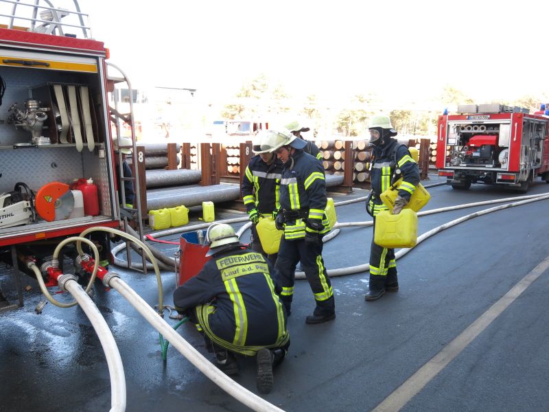 Unter der Leitung von Kreisbrandrat Norbert Thiel wurde der Brand, der sich auf eine Fläche von 200 bis 300 Quadratmetern des Untergeschosses ausgebreitet hatte, von rund 130 Feuerwehrkräften mit einem massiven Schaumangriff von drei Seiten unter Kontrolle gebracht. Aufgrund des absehbar hohen Bedarfs an Mehrbereichschaummittel erfolgte frühzeitig die Alarmierung der Berufsfeuerwehr Nürnberg mit einem Wechselladerfahrzeug samt Abrollbehälter-Schaum. Wertvolle Dienste leistete wieder einmal der Leichtschaumgenerator der Laufer Feuerwehr. Ebenso wurde ein, bei der Werkfeuerwehr Siemens in Erlangen stationierter, Großraumlüfter zur Entrauchung der riesigen Hallen eingesetzt.