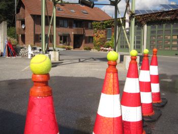 Station 1: Tennisbälle von Leitkegeln mittels Kübelspritze spritzen
