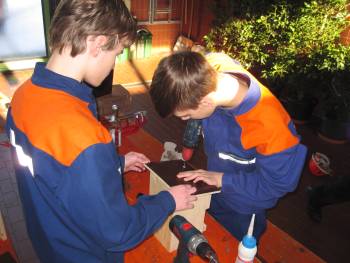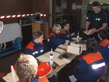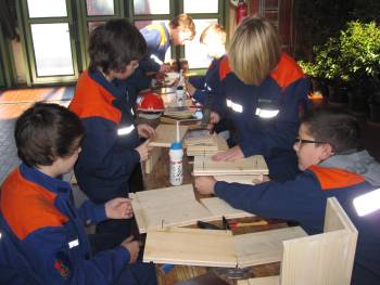 Um den sicheren und richtigen Umgang mit verschiedenen Handwerkzeugen wie Hammer, Zange und Akkuschrauber zu üben, stand der Bau von Vogelnistkästen auf dem Programm. Feuerwehrkamerad Christian Bieber hatte entsprechende Holzplatten vorgesägt, so dass nach einer kurzen Einweisung gleich mit dem Bau begonnen werden konnte. In 2er-Teams wurde eifrig geschraubt, gehämmert, geleimt und geschliffen, bevor jeder Jugendliche am Ende der Ausbildung seinen eigenen Nistkasten mit nach Hause nehmen konnte.