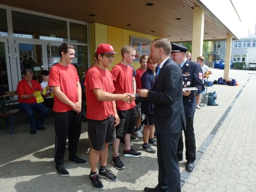 Nach Abschluss der Prüfungen konnten sich alle Teilnehmer bei einem kleinen Imbiss stärken. Im Anschluss ergriffen Kreisjugendwart Gerhard Barth und Landrat Armin Kroder das Wort, hier wurde das Engagement und die Bereitschaft zur Teilnahme, ebenso wie der kameradschaftliche Zusammenhalt der Gruppen untereinander gelobt. Die Übergabe der Leistungsabzeichen übernahmen Landrat Armin Kroder und Abnahmeberechtigter Matthias Hiltner (Lkr. Roth).