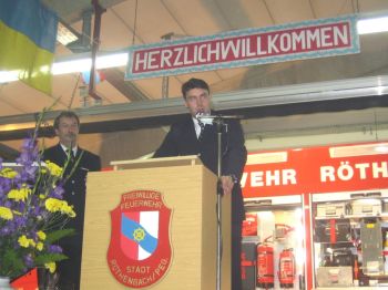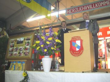 Seit 15 Jahren besteht die Freundschaft zwischen den Feuerwehren Werdau und Röthenbach. Ebenfalls in Form einer PowerPoint-Präsentation ging Kommandant Keim auf die vielen gegenseitigen Besuche und die damit verbundenen Feierlichkeiten ein, die in diesen 15 Jahren stattfanden. Erste Kontakte knüpften Kommandant Keim und der frühere Werdauer Kommandant Walter Tröger anlässlich des Stadtempfangs im Jahr 1990. „Peter Daßler und ich sind uns einig auch in Zukunft diese sächsisch-bayrische Feuerwehrfreundschaft zu pflegen und in Ehren zu halten“, so Kommandant Keim. Peter Daßler und der Werdauer Oberbürgermeister Volkmar Dittrich stellten im Rahmen ihrer Grußworte ebenfalls den hohen Stellenwert dieser Feuerwehrfreundschaft heraus. Zahlreiche gegenseitige Geschenke werden sicher an dieses Jubiläum erinnern. Alain Lavabre und Andres Hirschmugl ließen es sich nicht nehmen namens der französischen bzw. österreichischen Kameraden zur Fahrzeugübergabe und zur 15-jährigen Feuerwehrfreundschaft zu gratulieren.