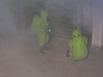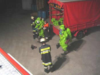 Angenommen wurde ein Feuer in dem Gefahrstofflager, sowie der Brand zweier Flüssiggastanks. In dem Lager, in dem giftige und ätzende Stoffe untergebracht sind, wurde ein Arbeiter vermisst. Die genaue Zusammensetzung der Gefahrstoffe war beim Eintreffen der ersten Einsatzkräfte noch unklar. Über den Schlüsseltresor am Haupteingang, auf den die Feuerwehr nach einem Alarm der Brandmeldeanlage zugreifen kann, konnte das schwere Einfahrtstor für die Fahrzeuge geöffnet werden.
