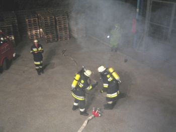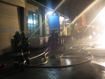 Von der Einsatzleitung, die dem 1. Kdt. Klaus Keim und als Zugführer dem 2. Kdt. Gerhard Bertl oblag, wurden nach der Erkundung umgehend zwei Einsatzabschnitte eingerichtet. Das zuerst eintreffende Löschgruppenfahrzeug LF 16/12 und die Drehleiter gingen vor dem brennenden Lagergebäude in Stellung. Gemeinsam mit weiteren Kräften des 1.Zugs konzentrierten sich die Einheiten in der Anfangsphase auf das Retten der vermissten Person, sowie darauf, eine Brandausbreitung zu verhindern. Während sich der Angriffstrupp mit Chemieschutzanzügen (CSA) ausrüstete, nahmen weitere Trupps unter schwerem Atemschutz bereits zwei C-Rohre im Außenangriff vor. Der Vermisste konnte in der stark verrauchten Lagerhalle vom Angriffstrupp kurz darauf rasch aufgefunden und aus dem Gefahrenbereich gebracht werden, so dass sich die Einsatzkräfte nun auf die Brandbekämpfung konzentrieren konnten.