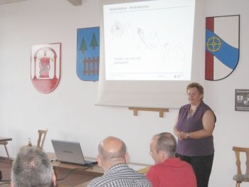 Damit die lebensrettenden Handgriffe im Ernstfall auch sitzen, mussten die Wehrmänner die richtige Handhabung nach einer ausführlichen Einweisung durch den Gerätehersteller und das BRK auch praktisch proben. Bewusstseinskontrolle, Atemkontrolle, Notruf absetzen, Herzdruckmassage einleiten, Patient beatmen, Defibrillator in Betrieb nehmen, Schock auslösen.