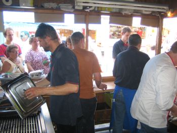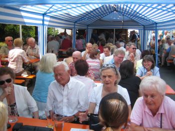 Die Freiwillige Feuerwehr Röthenbach bot wieder ihren traditionellen Spießbraten mit hausgemachtem Kartoffelsalat an, der ebenso wie die "Haxn" und die Nürnberger Bratwürste reißenden Absatz fand. In den Mittags- und frühen Abendstunden waren die Biertische bis auf den letzten Platz gefüllt, so dass insbesondere die Küchenmannschaft und die Bedienungen (nicht nur aufgrund der großen Hitze) mächtig ins Schwitzen gerieten. An dieser Stelle herzlichen Dank all unseren "Stammgästen", die jedes Jahr wieder zu "ihrer" Feuerwehr kommen.