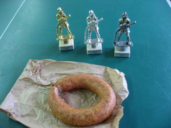 Nach spannenden Zweikämpfen standen schließlich mit Simon Gloege, Florian Dierl und Volker Hierteis die ersten drei Sieger fest. Sie konnten aus den Händen von Kommandant Klaus Keim eine Urkunde und einen Pokal entgegennehmen. Auf den Plätzen vier bis sechs reihten sich die Kameraden Mathias Triller, Ralf Dürrler und Sven Messing ein. Auch sie erhielten zur Erinnerung eine Urkunde; die traditionelle Stadtwurst ging wie immer -so zu sagen als "Trostpflaster" - an den Letztplatzierten.