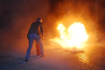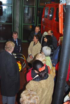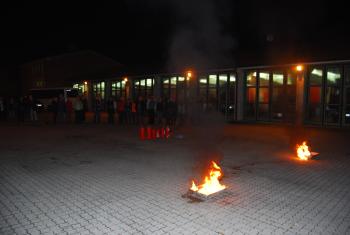 Nach einer Besichtigung der Feuerwehrfahrzeuge und der Wache hatten alle Teilnehmer die Möglichkeit unter Anleitung den richtigen Einsatz von Feuerlöschern zu üben. Die Wehrmänner hatten dazu zwei kleine Wannen mit Diesel gefüllt und in Brand gesteckt.