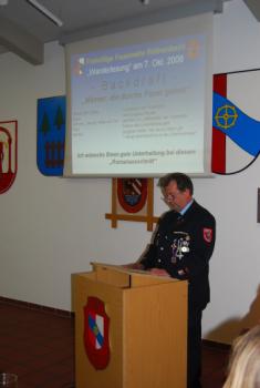 Hauptbestandteil des Abends war jedoch eine Lesung aus dem Roman „Backdraft“. Das Buch handelt von Feuerwehrmännern aus Chicago (USA), die von einem Brandstifter in Atem gehalten und dabei gefährlichen Situationen ausgesetzt werden. Bekannt ist die Handlung aus dem gleichnamigen Film, der Grundlage des Buches war. Kommandant Klaus Keim trug den gespannten Zuhörern im Veranstaltungsraum der Feuerwache zum Abschluss des Besuchs fünf Seiten aus dem Roman vor und weckte bei dem ein oder anderen die Lust, die Geschichte selbst einmal zu lesen.