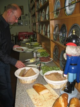 Kommandant Klaus Keim begrüßte die anwesenden Kameraden mit ihren Familien in der Röthenbacher Feuerwache und lud zu einem kleinen Imbiss und steirischem Wein, einem Gastgeschenk der österreichischen Partnerfeuerwehr Bad Gleichenberg vom August 2009 anlässlich des Blumenfestbesuches.