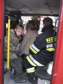 Wie bei anderen Gelegenheiten auch, zogen die Fahrzeuge insbesondere die kleinen Besucher des Martinimarktes in ihren Bann. Viele Kinder ließen sich die seltene Gelegenheit nicht entgehen, sich einmal an das Steuer der Drehleiter oder des Löschfahrzeugs zu setzen und von oben herab zu Papa und Mama hinunter zu winken.