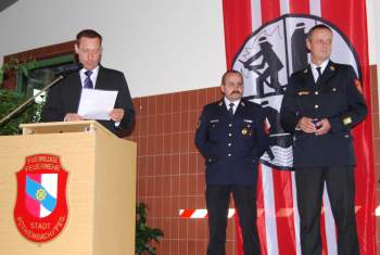 Zur feierlichen Ehrung in der festlich geschmückten Fahrzeughalle konnte Kommandant Keim neben zahlreichen Feuerwehrmännern und ihren Familienangehörigen auch Landrat Armin Kroder, Ersten Bürgermeister Günther Steinbauer, Kreisbrandrat Norbert Thiel, Kreisbrandinspektor Fritz Holfelder sowie zahlreiche Stadträte begrüßen. Willkommen heißen konnte er auch Ehrenkommandant Kurt Bittermann und Ehrenmitglied Erich Böttcher.