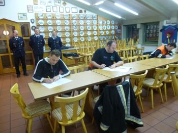 Unter den kritischen Augen der Kreisbrandinspektion von KBM Jörg Leipold mit seinem Schiedsrichterteam Wolfgang Bonkat (FF Neunkirchen a.S.) und Thomas Geißler (FF Behringersdorf) mussten die Lehrgangsteilnehmer im theoretischen Teil der Prüfung 50 Fragen beantworten. Die praktischen Prüfungen gliederten sich in
